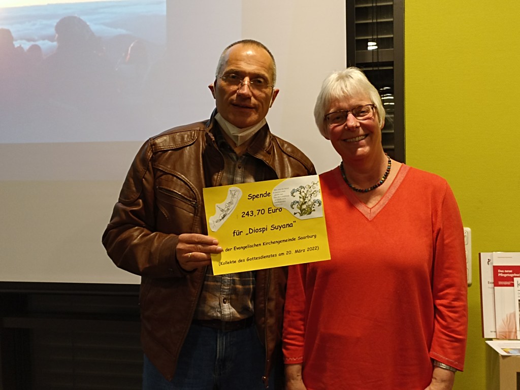 Glücklicherweise kannte sich der Gast aus Peru beim Thema Diospi Suyana etwas besser aus. Die Präsentation und das nachfolgende Gespräch hatten in diesem illustren Kreis eine ganz persönliche Note. Alle Zuhörer:innen brachten viel Interesse mit. Und am Ende ging es wieder um Tod und Leben sowie das Handeln Gottes in einer Welt, die immer hoffnungsloser wird. Ruth Kramer überreichte im Namen der Evangelischen Kirchengemeinde Saarburg einen Scheck an Dr. John. Mit mehr als 35 Besucher:innen und einem sehr lebendigen und interessanten Vortrag war es ein Abend, der alle bereicherte.