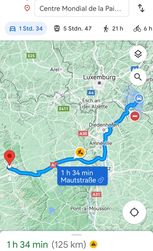 Lange haben wir geplant und nun sind wir endlich auf dem Weg nach Verdun. Als ersten Ort fahren wir heute zum Centre Mondial de la Paix, des Libertés et des Droits de l’Homme. Dort werden wir von Philippe Hansch, dem Direktor des Zentrums, empfangen, gemeinsam mit unseren Freunden aus Mamer. Wir alle stehen unter dem Motto „All4Peace“ für Frieden, Freiheit, Freundschaft und unsere demokratischen Werte. Mit dabei ist auch eine Gruppe aus Saarburg, die auf eigene Faust die Gedenkstätten von Verdun besucht. Vorbei geht’s auf dem Weg nach Verdun auch in Schengen, Luxemburg… Und schon haben wir ganz schnell unser Nachbarland Frankreich erreicht.